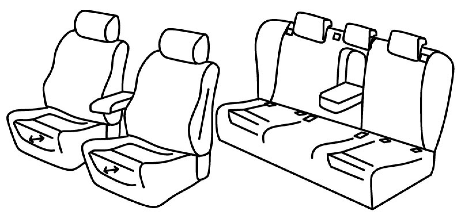 front seats ergonomic, front seats have plastic backside covered by seat cover, airbag, front armrest freestanding (not connected to front seats), front headrests cannot be removed, rear upper seat foldable (2/3 + 1/3), on backside of rear upper seats there are two horizontal hooks for trunk cover, rear bottom seat in one piece (1/1), rear armrest, third (middle) seat belt in rear upper seat, rear poles on sides, rear middle upper seat does not have opening for skis, isofix