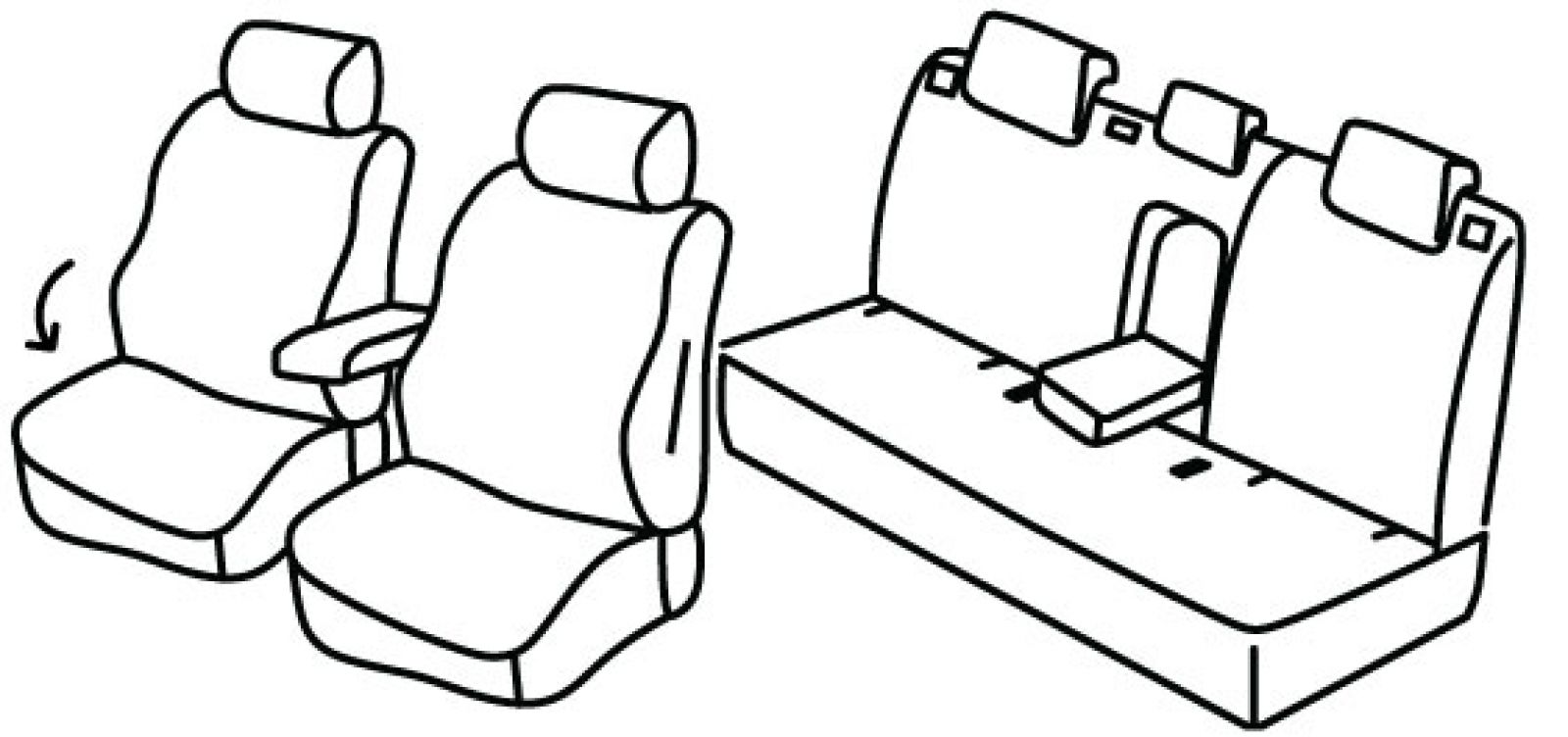 front seats normal, front passenger upper seat foldable, front headrests cannot be removed, airbag, rear upper seat foldable (2/3 + 1/3), rear bottom seat in one piece (1/1), rear armrest, rear headrests are lowered (2+1), isofix connected to seat cover, third (middle) seat belt in rear upper seat, front armrest freestanding (not connected to front seats)