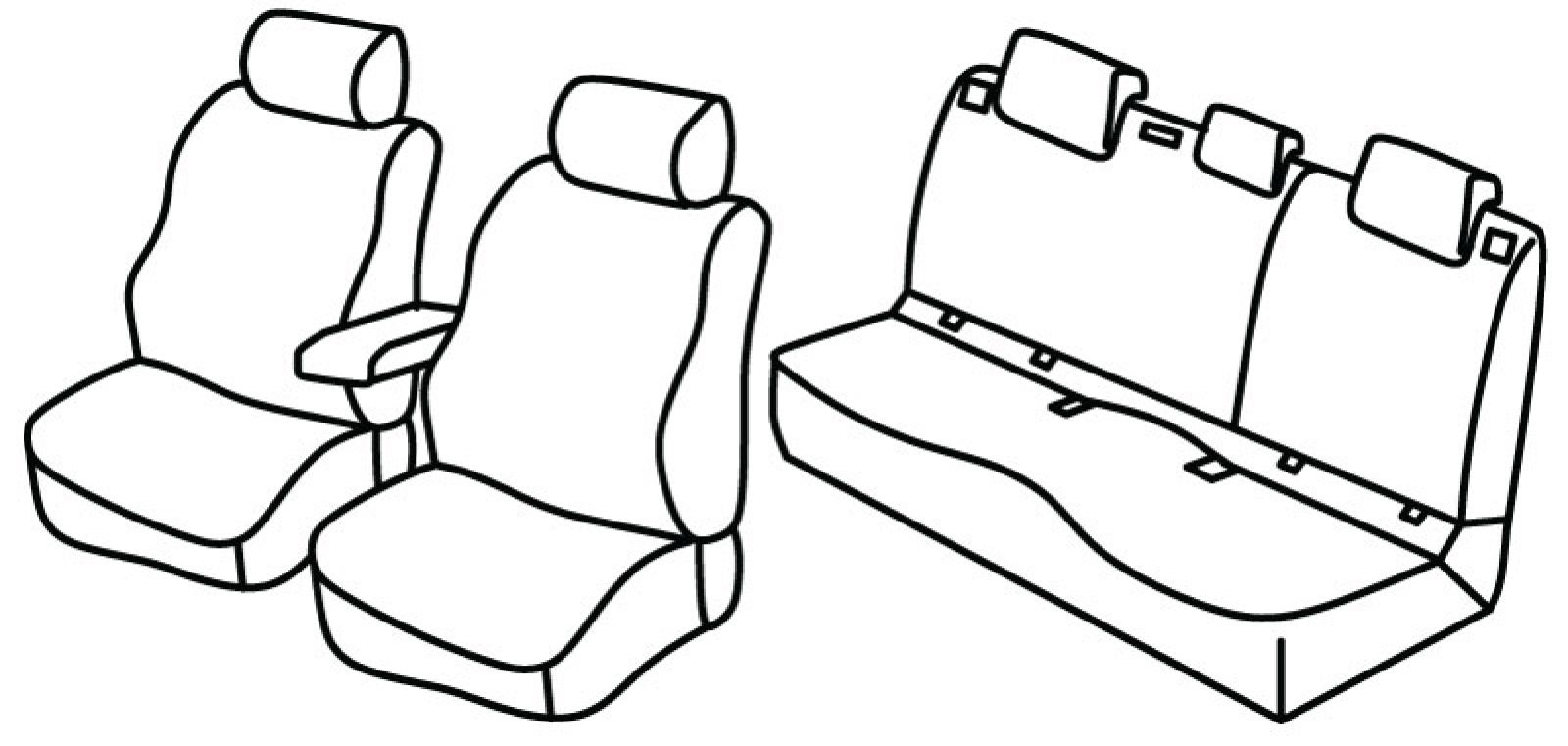 front seats normal, front headrests cannot be removed, front armrest freestanding (not connected to front seats), 3 airbags (driver seat on both sides, passenger seat on side to the door), rear upper seat foldable (2/3 + 1/3), rear bottom seat in one piece (1/1), third (middle) seat belt in rear upper seat, isofix connected to seat cover, rear headrests are lowered (2+1)