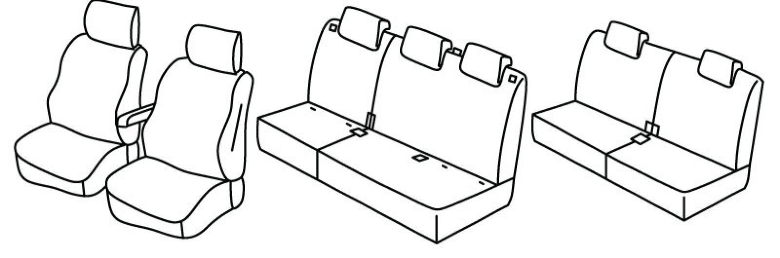 front seats normal, front bottom seats have a handle on external side, airbag, front seats have plastic foldable tables on backside, front armrest connected to driver seat, rear upper and bottom seat foldable (1/3 + 2/3), handle on the rear upper wider seat, isofix connected to seat cover, 3rd row: upper and bottom seat foldable (1/2 + 1/2), rear headrests are lowered
