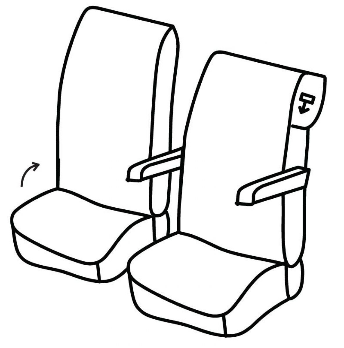 front seats in one piece with headrests, driver's seat belt in upper seat, 2 front armrest connected to driver seat, driver and front passenger upper seat are not the same size, passenger seat foldable