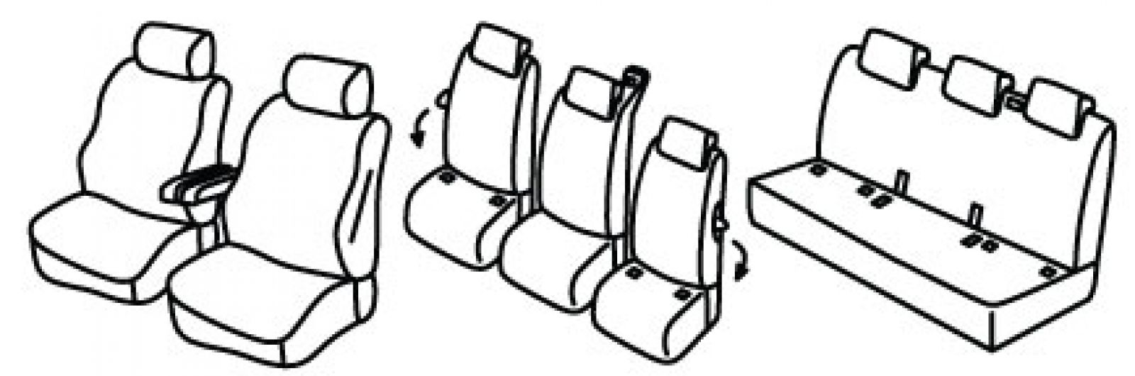 3 seat rows, 1st row: front seats normal, 2 front armrests connected to front seats, 3 airbags (driver seat on both sides, passenger seat on side to the door), 2nd row: 3 separate seats, isofix connected to seat cover, seat belt only at the middle rear upper seat, 2 handles for folding rear side upper seat, 3rd row: rear upper and bottom seat in one piece, third (middle) seat belt in rear upper seat, isofix connected to seat cover