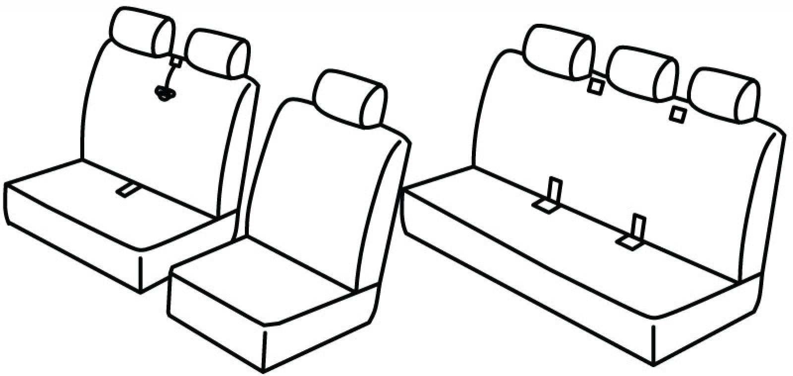 2 seat rows, 1st row:1+2, upper and bottom double seat in one piece, seat belt in middle of double upper seat, headrests are normal, rear upper and bottom seat in one piece (1/1), 2 seat belts on upper rear seats