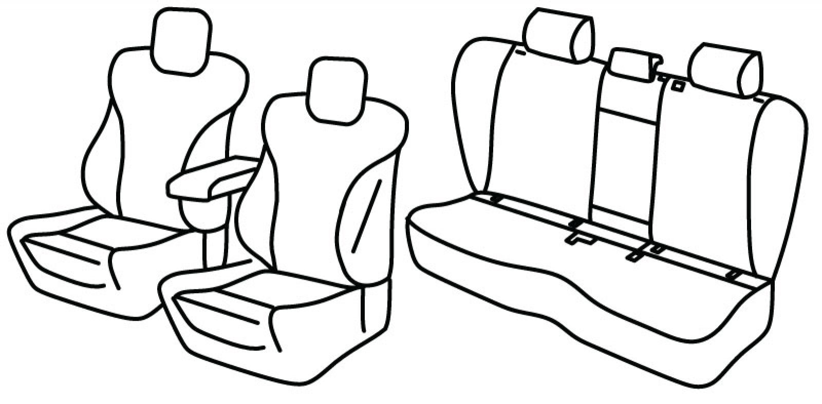 front seats sporty style, front headrests cannot be removed, front armrest in two pieces (not covered by seat cover), airbag, front seats have plastic backside covered by seat cover, rear upper seat foldable (1/3 + 1/3 +1/3), rear bottom seat in one piece (1/1), isofix connected to seat cover, rear poles on sides, third (middle) seat belt in rear upper seat, rear headrests 2 normal + 1 lowered