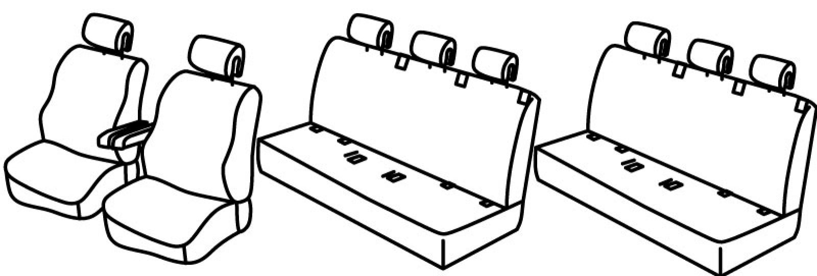 3 seat rows, headrests are foldable (sandwich), 2 front armrest connected to front seats, isofix connected to seat cover, 2nd row: 3 seat belts on upper rear seats, 3rd row: 3 seat belts on upper rear seats