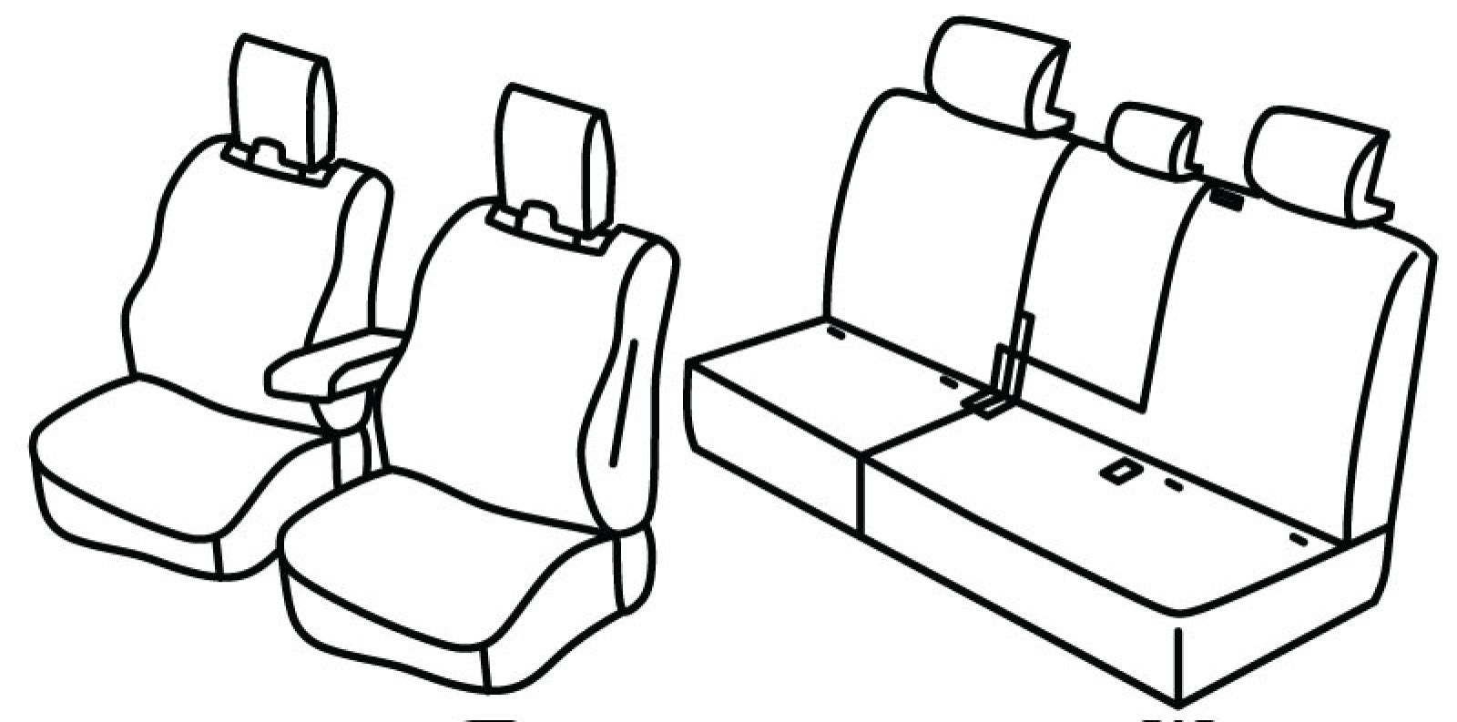 front seats sporty style, 3 airbags (driver seat on both sides, passenger seat on side to the door), front armrest in two pieces (not covered by seat cover), rear armrest, rear upper and bottom seat foldable (1/3 + 2/3), third (middle) seat belt in rear upper seat, isofix connected to seat cover