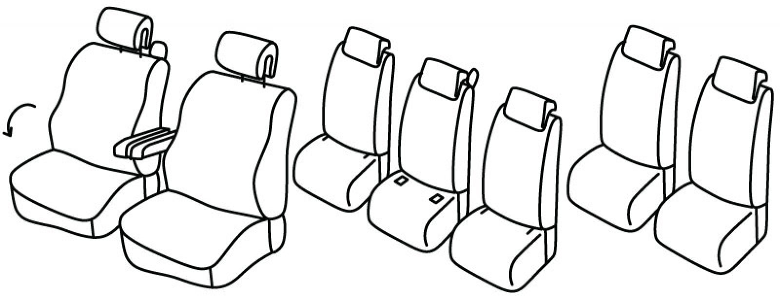 3 seat rows, front seats normal, front seats could have plastic foldable tables on backside, handle for folding front upper passenger seat is on inner side of seat, front passenger upper seat foldable into table for driver, front headrests are foldable (sandwich), 2 front armrest, 3 separate rear seats, handle on the rear upper seat, isofix connected to seat cover, rear middle seat has plastic backside