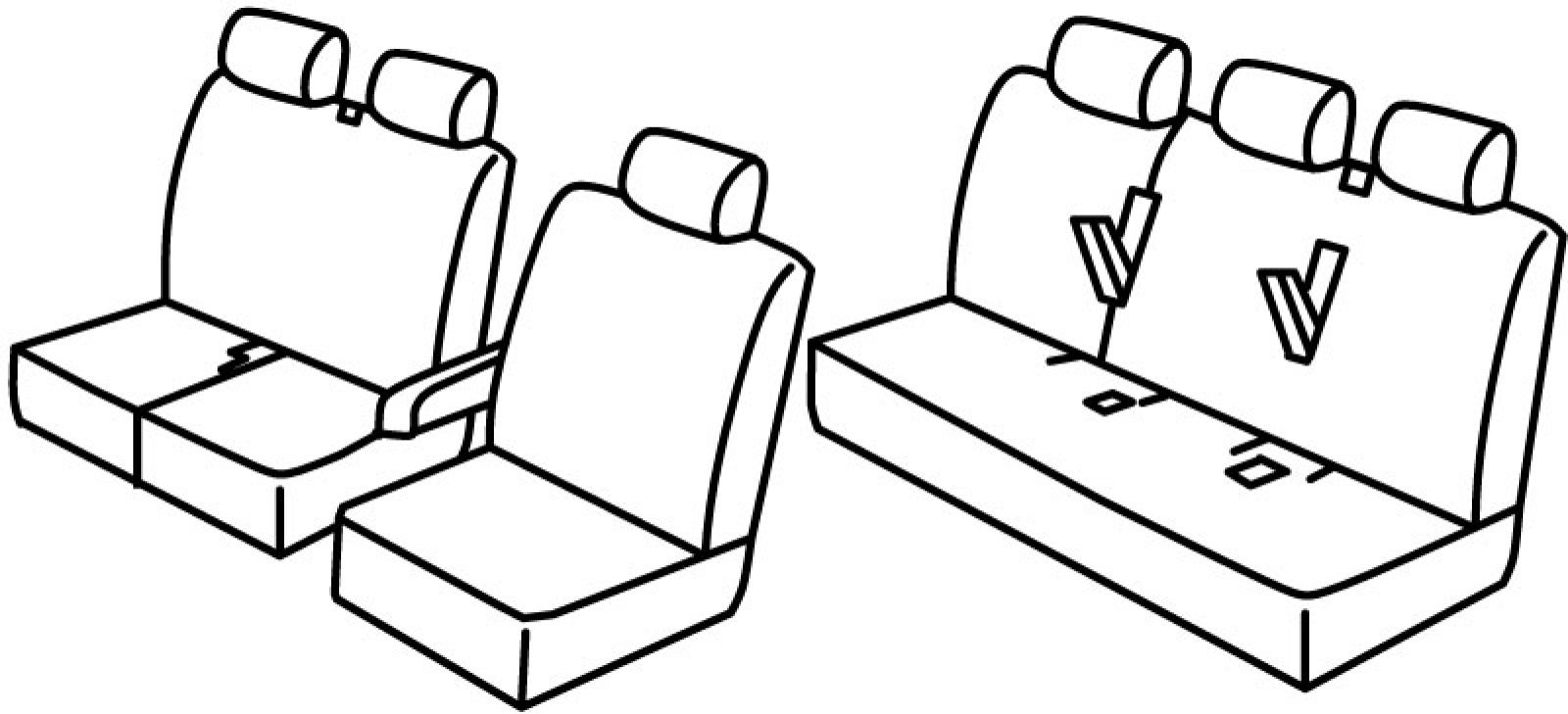 1st row: 1+2, front armrest connected to driver seat, seat belt in middle of upper front passenger seat, rear armrests integrated in rear upper seat, rear upper seat foldable (1/3 + 2/3), rear bottom seat in one piece (1/1)