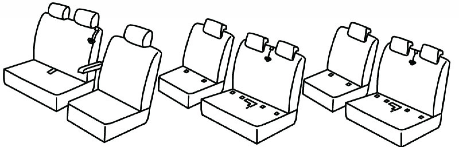 1st row: 1+2, airbag, front armrest connected to driver seat, front passenger seat belt in upper seat, front headrests are different sizes, 2nd and 3rd row: rear headrests are lowered, seat belt in middle of double upper seat, isofix connected to seat cover