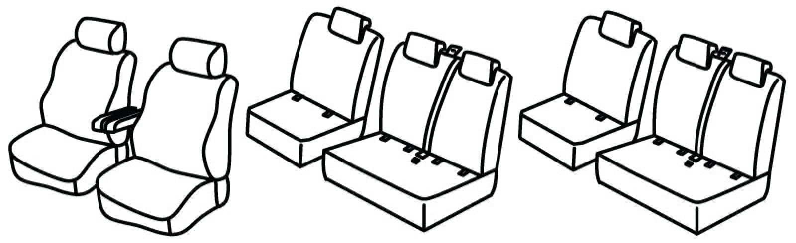 1st row: 1+1, 2 front armrest connected to front seats, front seats have plastic backside, front seats have plastic foldable tables on backside, 2nd row: 3 separate rear upper seats, bottom double seat in one piece, third (middle) seat belt in rear middle upper seat, isofix connected to seat cover, 3rd row: 3 separate rear upper seats, bottom double seat in one piece, third (middle) seat belt in rear middle upper seat, isofix connected to seat cover