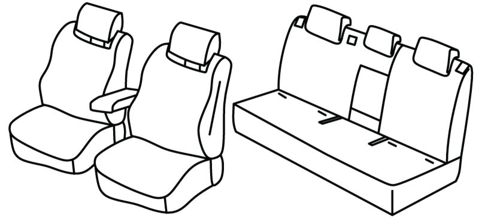 front seats normal, airbag, front headrests are normal, front armrest freestanding (not connected to front seats), rear upper seat foldable (2/3 + 1/3), rear bottom seat in one piece (1/1),rear armrest, in rear armrest integrated cup holder (square shape), third (middle) seat belt in rear upper seat, isofix connected to seat cover