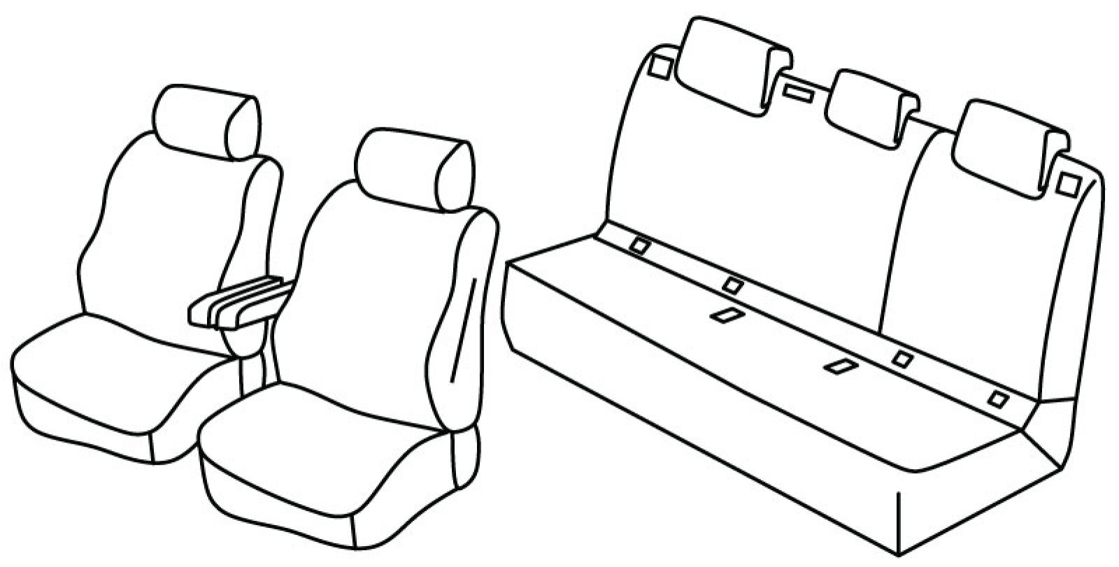 front seats normal, 3 airbags (driver seat on both sides, passenger seat on side to the door), front headrests cannot be removed, front armrest connected to front seats, rear upper seat foldable (2/3 + 1/3), rear bottom seat in one piece (1/1), third (middle) seat belt in rear upper seat, isofix connected to seat cover, rear headrests are lowered (2+1)