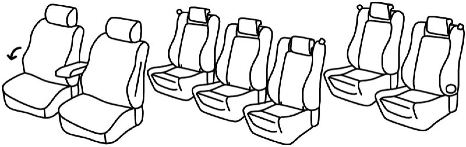3 seat rows, front seats normal, airbag, front armrest freestanding (not connected to front seats), passenger bottom seat has optional folding, front seats have plastic foldable tables on backside, front headrests are normal, 2nd row: 3 separate rear seats, isofix connected to seat cover, 2nd and 3rd seat row: handles for folding upper seat, rear headrests are lowered