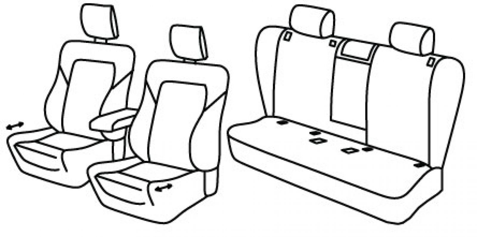 front seats ergonomic, front seats can be sliding but seat cover fits only when seat is completely pulled in, front armrest freestanding (not connected to front seats), front seats have plastic backside covered by seat cover, airbag, rear upper seat foldable (2/3 + 1/3), rear bottom seat in one piece (1/1), rear armrest, rear poles on sides, isofix, front and rear side headrests cannot be removed, middle rear headrest integrated in rear upper seat