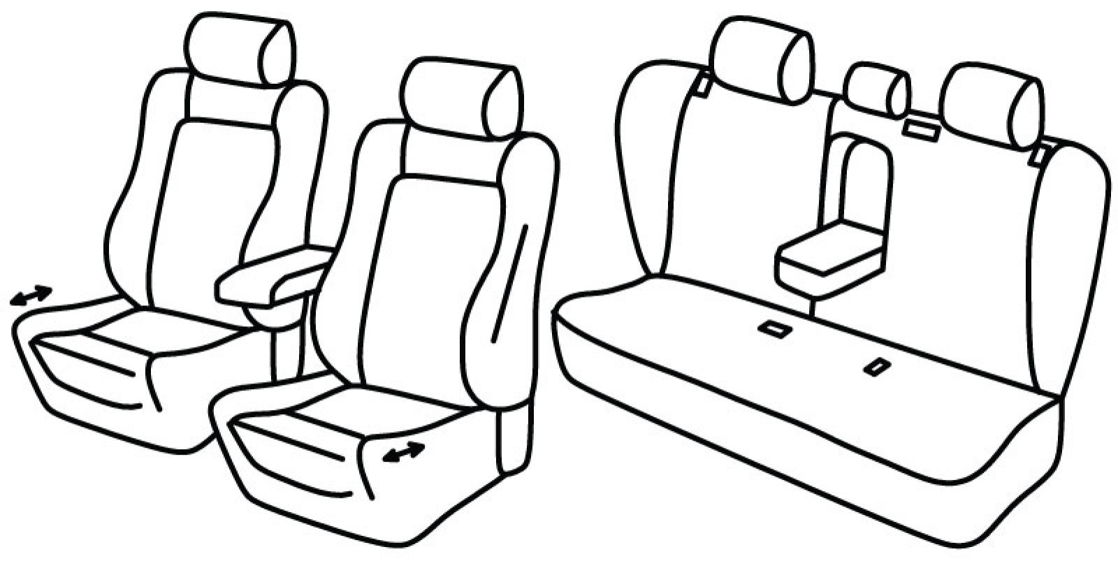 prednja sjedala profilirana, prednja sjedala su pomična ali presvlaka odgovara samo kad su sjedala potpuno složena, prednji naslon za glavu su aktivni, prednji naslon ruke konzolni (nije vezan za naslon sjedala), poleđina prednjih naslona od plastike koja se prekriva presvlakom, airbag, stražnji naslon djeljiv 1/3+2/3, stražnje sjedalo u komadu, stražnji naslon ruke, bočni stupići, isofix nije povezan s presvlakom, stražnji nasloni za glavu su normalni (2+1)