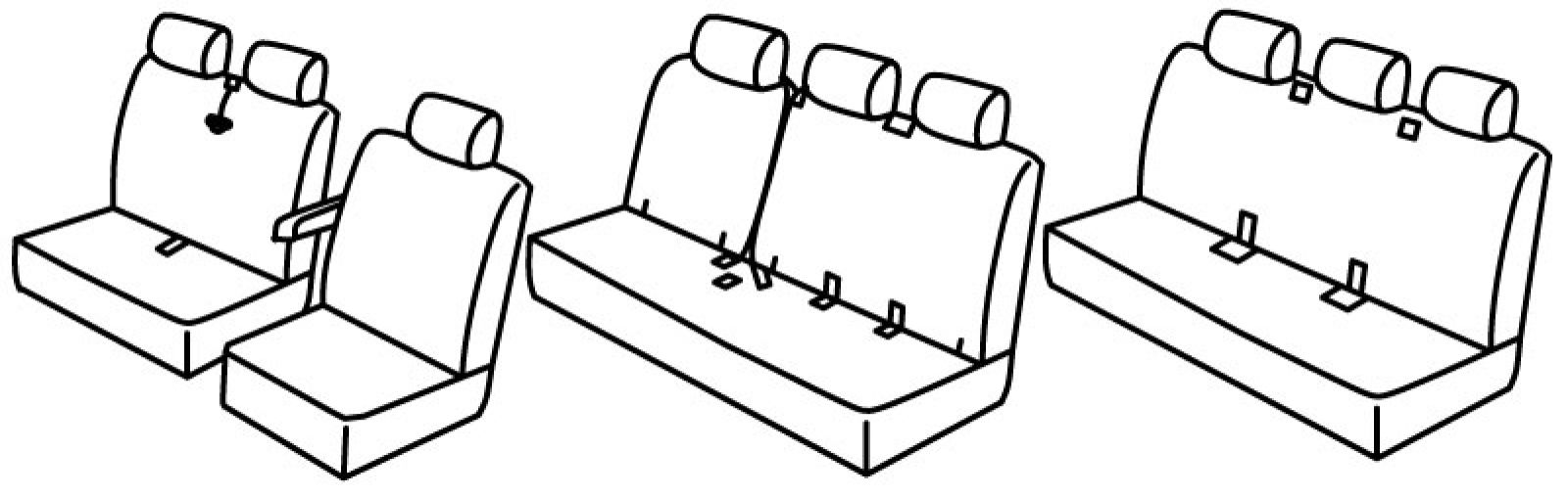 3 reda sjedala, nasloni za glavu su normalni, 1. red: 1+2, suvozačev pojas izlazi iz naslona, prednji naslon ruke konzolni (nije vezan za naslon sjedala), 2. red: stražnji naslon djeljiv 1/3+2/3, stražnje sjedalo u komadu, 3. red: stražnji naslon i sjedalo u komadu, 2. i 3. red: treći (srednji) pojas izlazi iz naslona