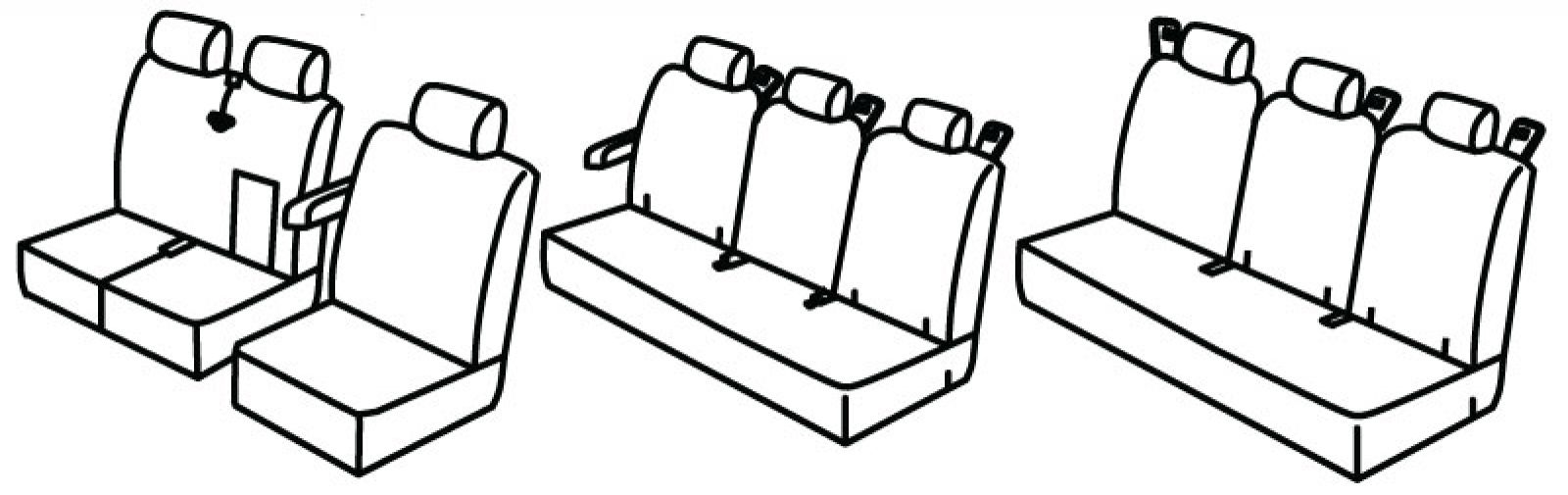 prednji naslon ruke vezan za naslon vozača, dupli naslon u komadu, suvozačevo sjedalo djeljivo (1/2+1/2), naslon srednjeg sjedala ima ugrađen naslon za ruku, suvozačev pojas izlazi iz naslona, 2. red: stražnji naslon djeljiv 1/3+1/3+1/3, stražnje sjedalo u komadu, 1 naslon za ruke s vanjske strane, 3 pojasa na stražnjem naslonu, isofix, 3. red: stražnji naslon djeljiv 1/3+1/3+1/3, stražnje sjedalo u komadu, 3 pojasa na stražnjem naslonu