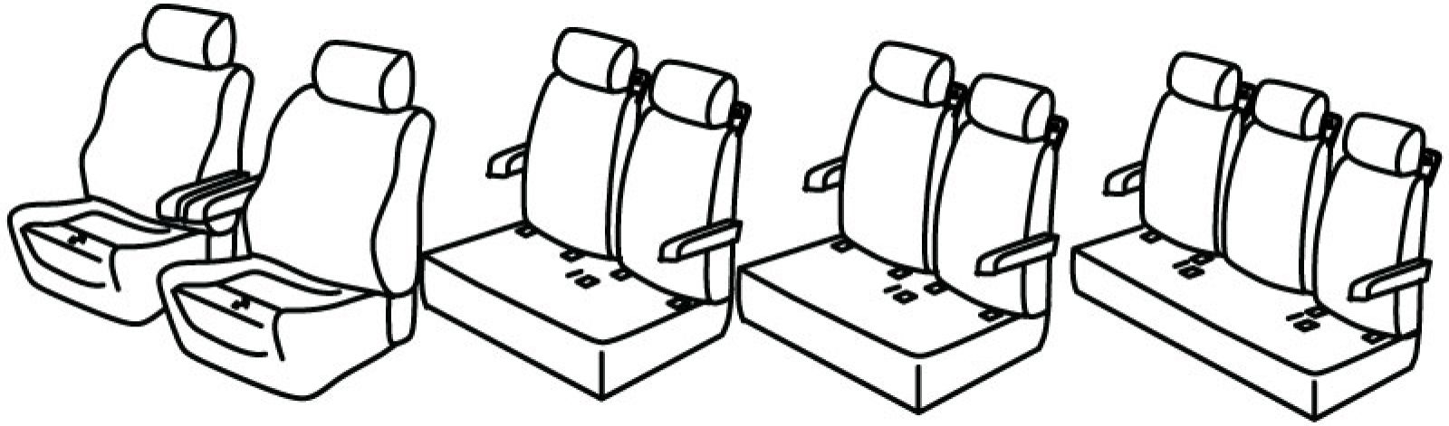 4 reda sjedala, prednja sjedala ergonomska, prednja sjedala su pomična ali presvlaka odgovara samo kad su sjedala potpuno složena, poleđina prednjih naslona od plastike, 2 prednja naslona ruke vezana za naslone sjedala, 2 i 3. red: 2 stražnja naslona za ruke spojena s naslonima, stražnji naslon djeljiv 1/2+1/2, stražnje sjedalo u komadu, 2 pojasa na stražnjem naslonu, isofix, 4. red: stražnje sjedalo u komadu, stražnji naslon djeljiv 1/3+1/3+1/3