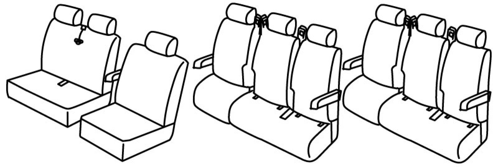 3 reda sjedala, 1. red: 1+2, poleđina vozačeva naslona od plastike, dupli naslon i sjedalo u komadu, prednji naslon ruke vezan za naslon vozača, 2 i 3. red: 3 zasebna naslona iza, 2 stražnja naslona za ruke s vanjske strane, isofix povezan s presvlakom, nasloni za glavu su normalni, dvije verzije prednjih naslona za glavu uključene u set