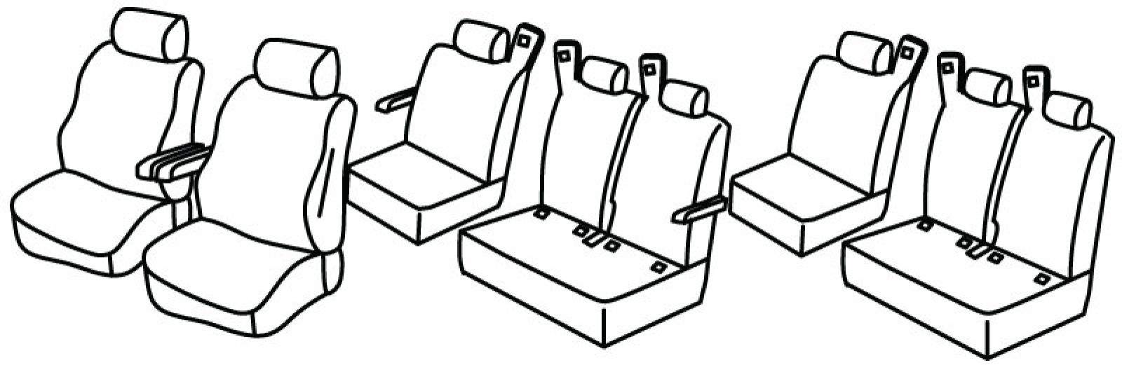 3 reda sjedala, 1. red: 1+1, poleđina prednjih naslona od plastike koja se prekriva presvlakom, 2 prednja naslona ruke vezana za naslone sjedala, airbag, 2 i 3. red: 3 zasebna naslona iza, stražnje sjedalo djeljivo 1/3+2/3, 2 stražnja naslona za ruke s vanjske strane naslona u drugom redu, isofix povezan s presvlakom, nasloni za glavu su normalni