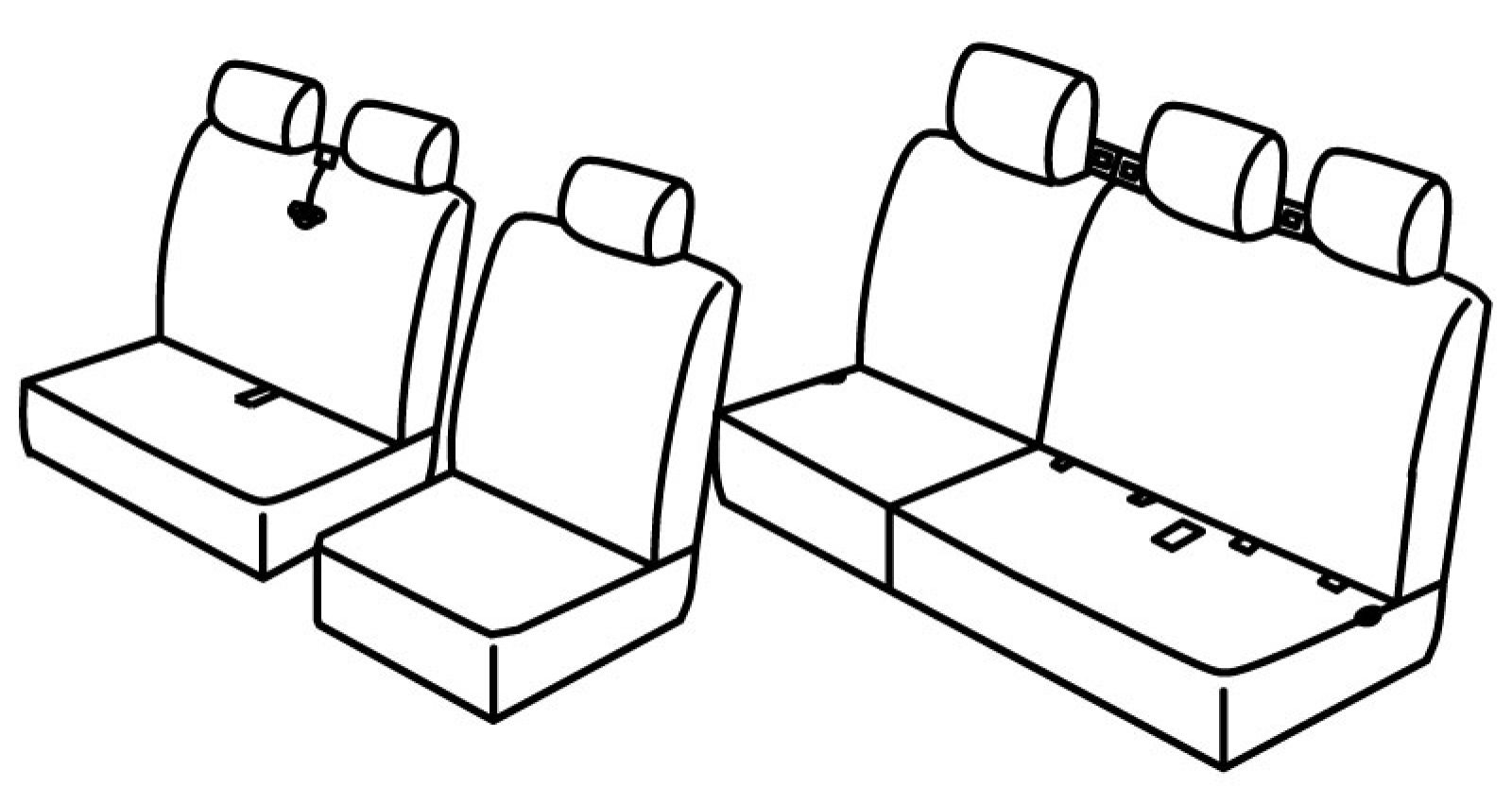 2 prednja naslona ruke vezana za naslone sjedala, prednja sjedala obična, poleđina prednjih naslona od plastike, 2. red: 2+1, 3. red: stražnji naslon i sjedalo u komadu, 2. i 3. red: isofix povezan s presvlakom,3 pojasa na stražnjem naslonu, nasloni za glavu su normalni